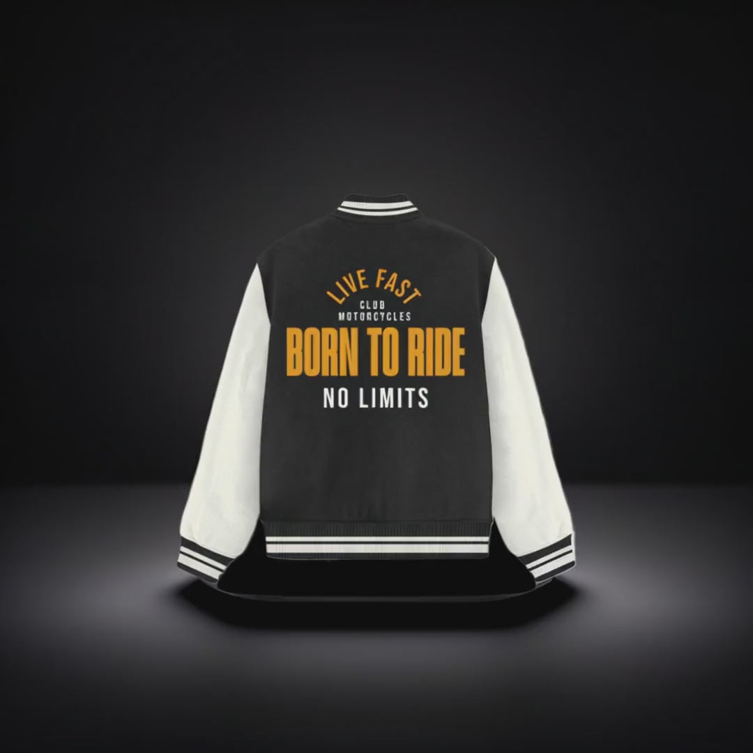 "Get ready to rev up your style with our ''Born to Ride'' Varsity Jacket! This isn’t just a jacket; it’s a ticket to the wild side of fashion. Whether you’re cruising down the boulevard or just lounging at home, this jacket screams ‘I’m too cool for the ordinary!’